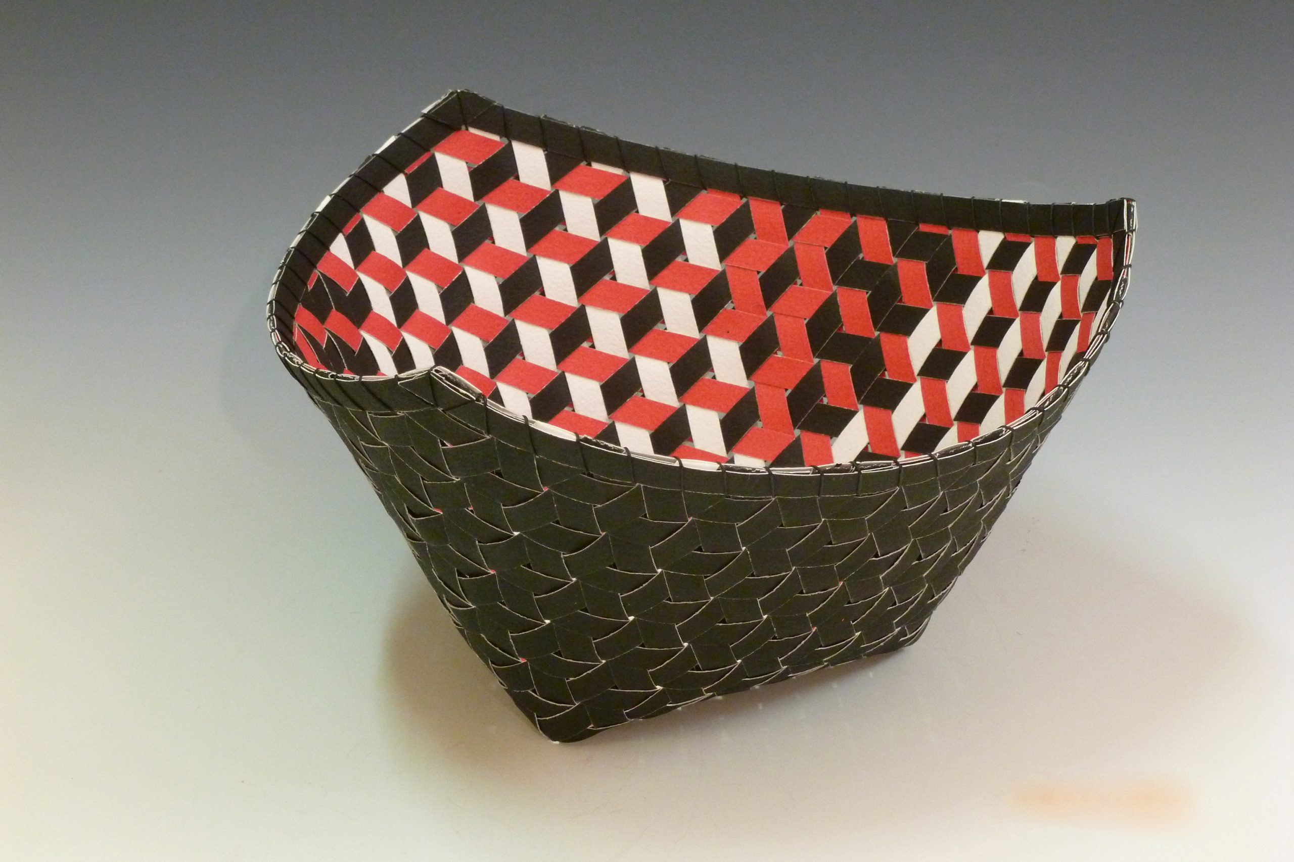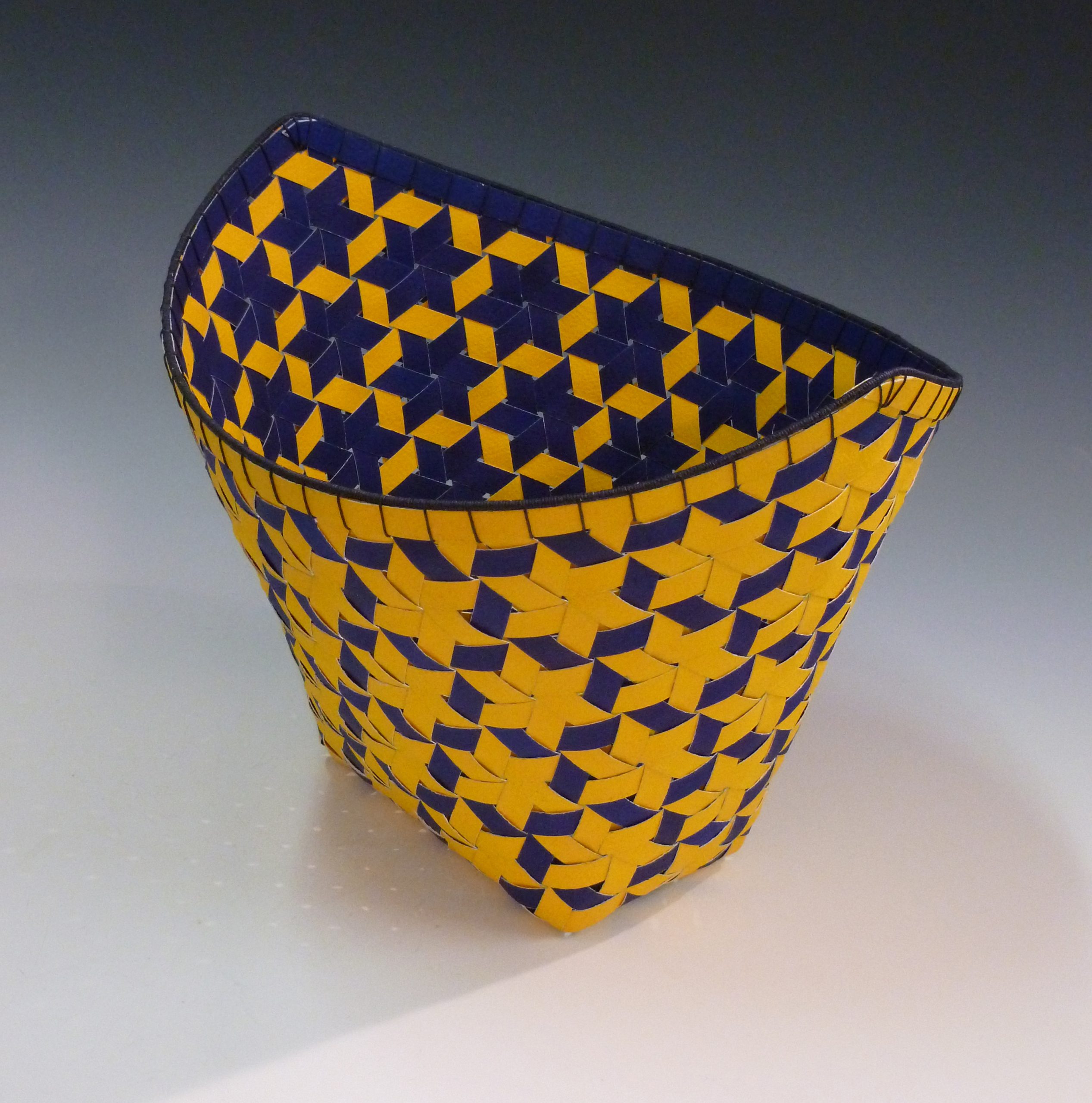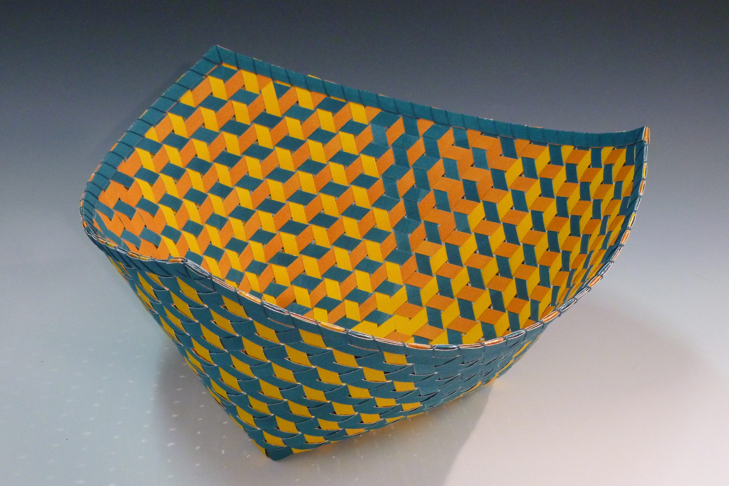 After years of exploring the woven form, I have mastered the art of diagonal twill and mad weave, with which I create forms and structures not normally found in the basketry world. My medium for this unique work is watercolor paper, which I’ve painted and cut into uniform strips to achieve the precision I seek. Approaching my work as a puzzle drives me to discover new shapes and weaving innovations. I am also very much interested in the math and geometric constraints of the work. I am intrigued by the potential outcome of any new design. The evolution of my body of work is built on taking risks, and avoiding the “known”. The risks offer challenges, which often lead to new directions. This is the excitement that keeps me working in a repetitive medium.